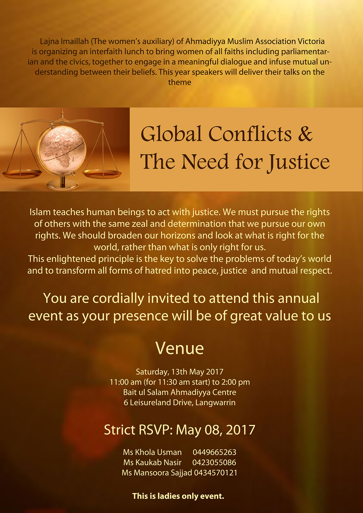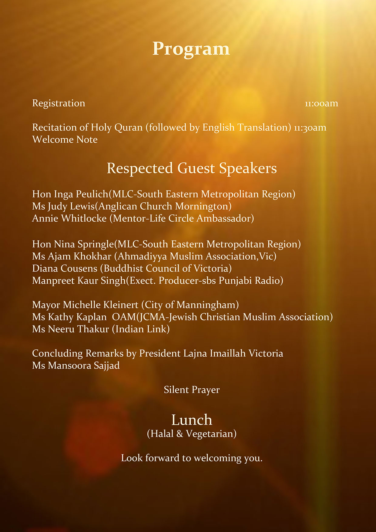 Lajna Imaillah (the women's auxiliary) of Ahmadiyya Muslim Association Victoria is organising an interfaith lunch to bring women of all faiths together to engage in a meaningful dialogue and infuse mutual understanding between their beliefs. You are cordially invited to attend this annual event. For program click here.