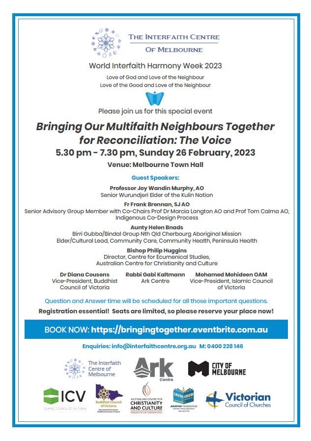 Religious and Community leaders and leaders from the wider community are invited to attend this special World Interfaith Harmony Week event to hear clear information about the Voice to Parliament from First Nations People with lived experience, and leaders who are working for Reconciliation.